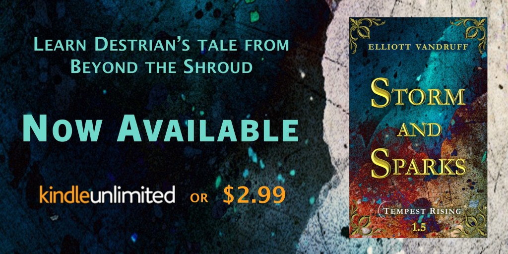 I’m thrilled to announce the release of an exciting companion novel to the Tempest Rising series! Introducing Storm and Sparks a retelling of the first book, Beyond the Shroud, but with a twist – it’s from Destrian’s point of view!